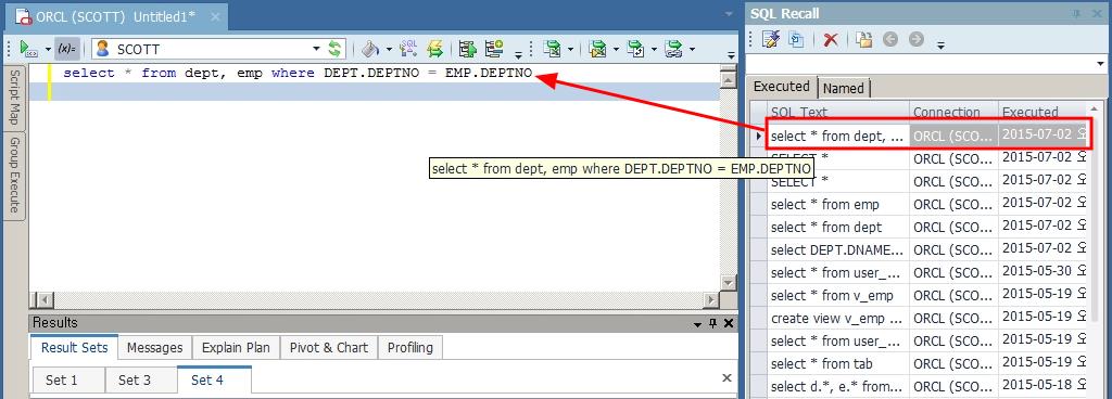 한 번 수행한 SQL문은 나중에 재사용할 수 있도록 Toad에 자동으로 저장됩니다. 이 SQL문장들은 Menu > View > SQL Recall을 선택하거나 단축키 F8을 눌러서 확인하거나 재사용 할 수 있습니다.