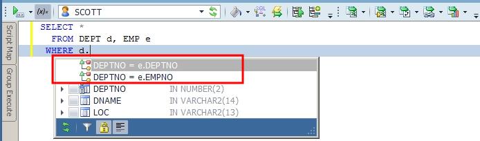 SQL 조인 문장을 작성할 때는 컬럼 뿐만 아니라 조인 조건도 팝업으로 표시됩니다.