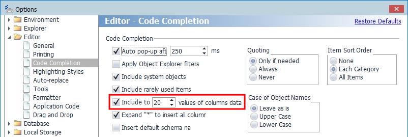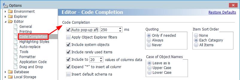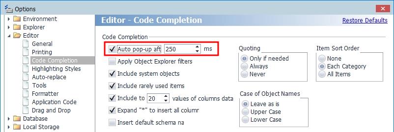 자동 완성에 대한 옵션은 Menu > Tools > Options에서 Editor > Code Completion을 선택합니다.
