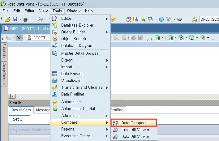 Data Compare의 사용 방법은 Menu > Tools > Compare > Data Compare를 선택합니다.