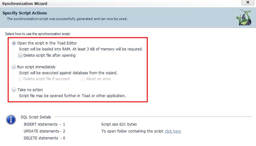 생성된 스크립트를 Editor 창에서 보여줄지 바로 실행을 할 지를 선택합니다. 창의 아래에는 스크립트에 대한 정보가 나타납니다.