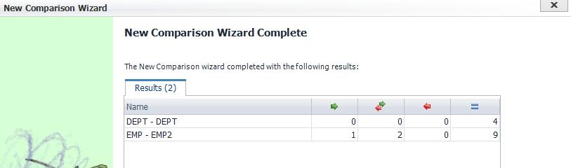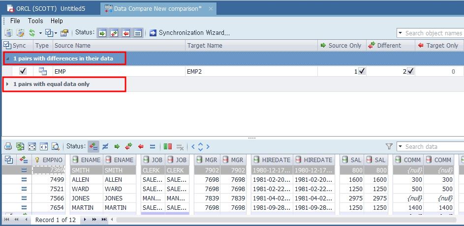 Finish버튼을 누르면 상세 비교 결과가 나타납니다. 4개의 테이블을 비교했으나 비교할 키 값이 존재한 2개의 테이블만 실제로 비교가 되었습니다. 창의 위쪽은 요약 정보, 창의 중간과 아래는 실제 데이터 값이 보입니다.