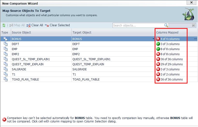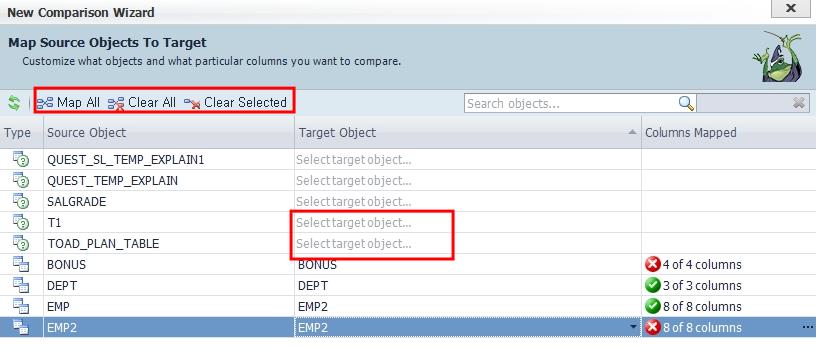창의 위쪽에 Clear All, Map Selected 등의 메뉴를 이용하여 비교할 대상을 선정합니다. 대상을 선정했으면 Target Object를 눌러 비교할 오브젝트를 선택합니다. 위에서 설명했듯이 키 값이 지정되어 있지 않아