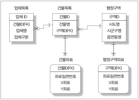 따라서 [그림1]과 같이 정규화 작업을 통해서 건물 좌표 정보를 따로 저장하는 1:M 관계인 건물좌표 엔티티를 별도로 정의해야 하고, 행정구역도 좌표 정보를 별도로 저장하는 행정구역좌표 엔티티를 추가해줘야 한다.