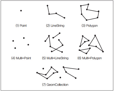 OGC에서 제시하고 있는 공간 데이터 타입은 Point, Line String, Polygon, Multi-Point, Multi-LineString, Multi-Polygon과 하나의 데이터 타입 안에서 위 6개의 데이터 타입들을 집합 형태로 표현할 수 있는 GeomCollection이 존재한다. [그림2]는 다양한 형태의 공간 데이터 타입을 보여주고 있다.