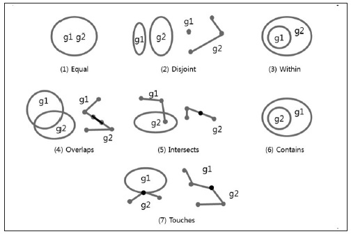 공간 관계 함수는 공간 객체들의 기하학적 공간 관계를 Boolean 형식으로 결과를 반환해주며, Equals, Disjoint, Touches, Within, Intersects, Contains 등의 함수가 존재한다. [그림1]은 공간 관계 함수의 예를 보여주고 있다.