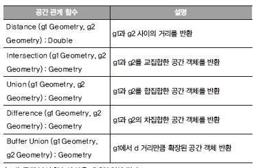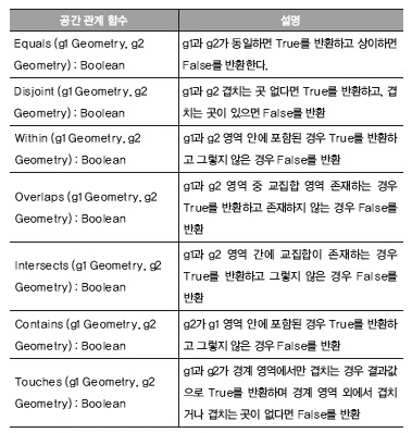 공간 함수는 크게 공간 관계 함수와 공간 분석 함수로 구분할 수 있다.