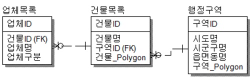 공간 데이터와 함수를 지원해주는 DBMS 환경에서 위치 기반의 업체 정보 검색 프로그램을 개발하기 위해서는 아래 [그림 2]과 같이 데이터 모델을 설계 할 수 있다.