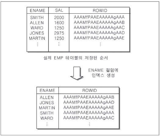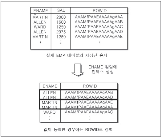동일한 ENAME 컬럼 값이 존재하면 해당 인덱스는 ROWID 컬럼으로 정렬해 인덱스를 생성한다. 그렇기 때문에 인덱스는 인덱스를 구성하는 첫 번째 컬럼에 의해 정렬을 수행한다.