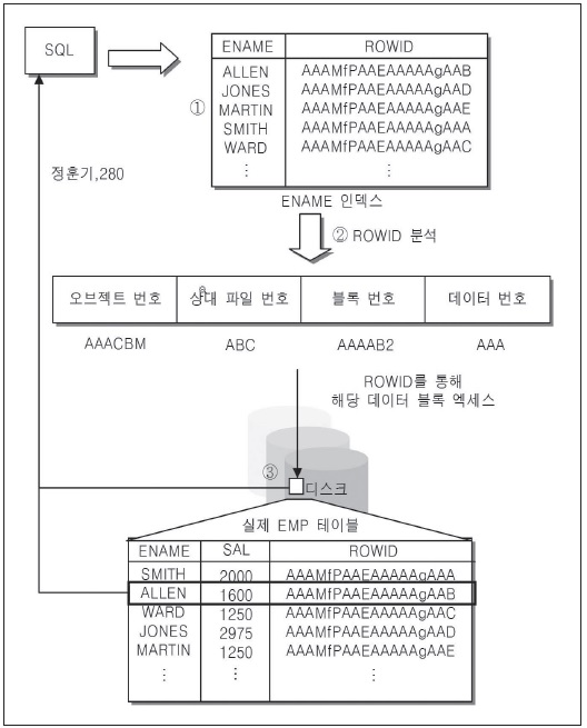 ③ ②단계에서 획득한 ROWID 정보를 이용해 EMP 테이블을 액세스한다. 이를 통해 데이터만 추출하게 된다.