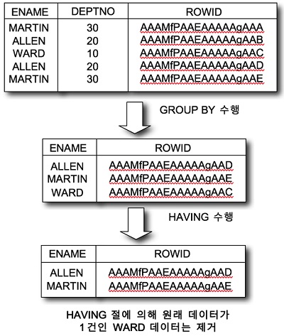그룹핑된 데이터는 HAVING 절에 의해 원본 데이터가 1건인 데이터가 그룹핑에서 제거된다. 따라서 ENAME 컬럼과 DEPTNO 컬럼의 값이 동일한 2건 이상의 데이터가 테이블에 존재하면 해당 데이터 중 ROWID 값이 최대 값이 쪽이 결과로 추출된다.