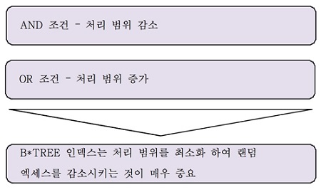 AND 연산은 조건이 추가될 때마다 처리 대상 집합이 감소한다. AND 연산자가 계속 추가되고 해당 조건으로 구현된 B*TREE 인덱스가 존재한다면 옵티마이저는 해당 인덱스를 이용해 SQL을 수행하게 된다.