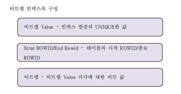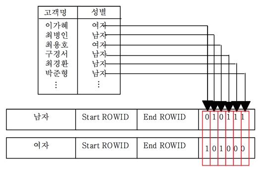 B*TREE 인덱스는 < 인덱스 Key, ROWID>가 인덱스 엔트리에 저장됐지만 비트맵 인덱스는 해당 인덱스 컬럼에 대한 비트맵이 <그림 4>처럼 저장된다.