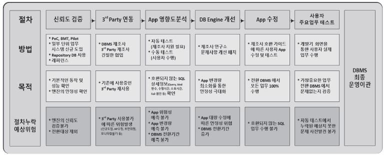 만약 신규 어플리케이션을 구축한다면 1번 조건을 만족하는 어떠한 DBMS를 사용하더라도 크게 문제가 되지 않을 것이다. 그러나 회사의 주요업무 대부분이 운영되고 있는 메인 DBMS를 교체한다면 그림 1-3과 같은 절차가 반드시 필요할 것이므로 1~4번 모두를 만족하지 않으면 각 단계별 위험성이 크게 존재하게 된다.