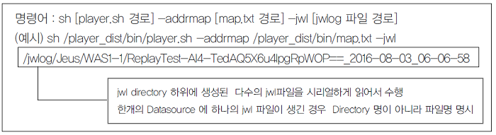 참고1) 2.2장 리플레이 구조에서 설명한 것처럼 플레이어(player)는 플랜 파일(rpf file)을 생성하여 해당 파일로 재현을 수행하게 되므로 1차 재현 이후 반복해서 재현 테스트를 수행할 경우 jwl 파일이 아닌 플랜 파일을 명시하여 명령어를 수행하는 것이 효과적이다( 명령어: sh [player.sh 경로] -addrmap [map.txt 경로] -rpf [rpf 파일 경로]).