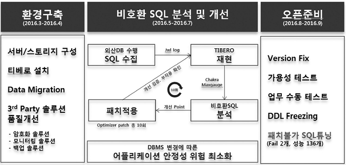 (외산 DB에서 수행되던 SQL을 수집해서 티베로에 재현하고 그 재현결과를 분석하여 문제점을 도출하면 티베로 연구소는 해당 문제가 개선된 패치를 제공하는데, 해당 패치로 인한 개선 효과, 안정성, 부작용 등을 검증하기 위해 기존에 수집한 로그를 다시 한번 재현 > 분석 > 문제점 도출 > 패치 과정을 반복하게 되므로 많은 시간이 필요할 수밖에 없다).