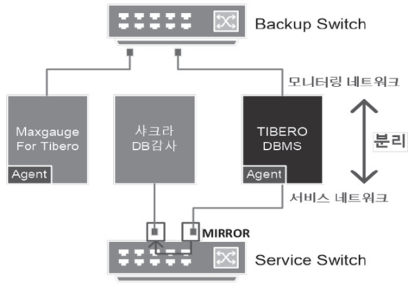 구성 참고 사항 : 맥스게이지 서버는 티베로 DB와 AGENT간 네트워크를 통해 정보를 수신한다. 따라서 티베로의 서비스 네트워크와 정보 전송 네트워크를 분리하여 데이터베이스 응답에 간섭이 없도록 하는 것이 바람직하다.