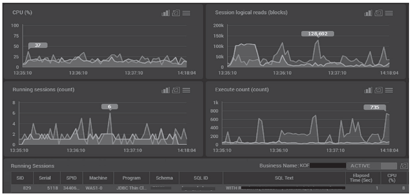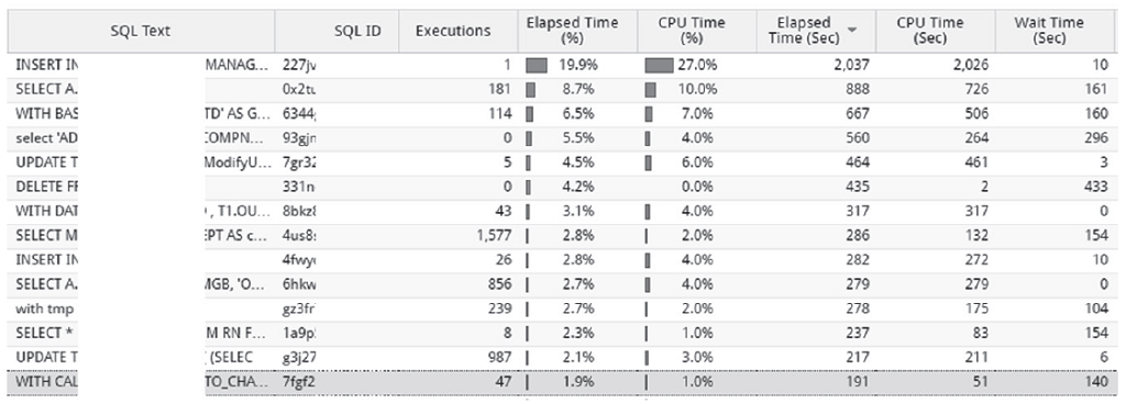 리플레이 재현을 했던 시간 동안의 Top SQL을 다양한 기준으로 확인할 수 있다. 이를 통해 패치별 문제가 되었던 대표적인 SQL들의 빠른 확인이 가능하다. 특히 기존 패치에 문제없던 SQL들 수행 시간이 높다면 패치의 부작용으로 판단하고 샤크라 를 통한 추가적인 분석을 하지 않고 연구소에 현상을 빠르게 리포트하여 짧은 시간 안에 개선된 패치를 다시 받을 수 있었다.