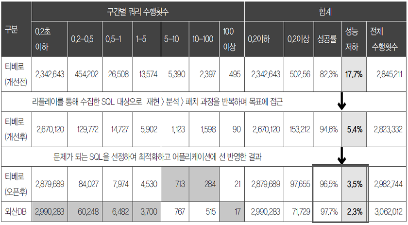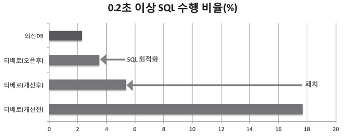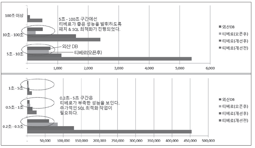 물론 외산 DBMS의 2.3% 수치에는 1.2% 정도 모자라지만 5초 이상 수행되는 악성일 가능성이 높은 SQL의 수행횟수는 오히려 티베로가 적기 때문에 오픈 이후 성능 이슈 없이 원활하게 운영되고 있다고 생각한다. 한편 0.2초 ~ 5초 구간은 여전히 티베로의 성능이 많이 부족하다. 현재 시점에서는 해당 구간 성능저하로 인해 발견되는 업무상의 문제는 없지만 외산 DBMS에 비해 비효율이 발생하는 부분을 찾아 최적화 작업을 진행할 예정이다.