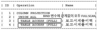 SQL 작성자는 바인드 변수를 입력하면 인덱스를 경유하고 입력하지 않는 경우(NULL)는 FULL SCAN을 타도록 옵티마이저가 알아서 분리 구성해주는 것을 기대하고 있으므로 4-15-2와 같이 항상 구성되어야 하는데, 바인드 변수를 입력하면 4-15-1과 같이 FULL SCAN을 타도록 PLAN이 구성되어 해당 SQL들의 성능저하가 심각하게 발생하였다.