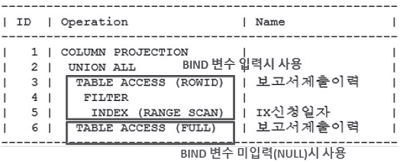 2) EQUAL 조건 NVL 사용 - 바인드 변수 미 입력 시(NULL) select * from 보고서제출이력 where 신청일자 = NVL(:신청일, 신청일자) AND ROWNUM <=5; PLAN이 두개로 잘 분리되어 있고, 바인드 변수를 입력 하지 않았으므로 FULL SCAN 플랜이 사용되었다.
