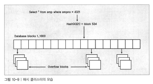 • cluster-key BETWEEN 50 AND 60과 같은 범위 조건은 해싱 알고리즘을 이용하여 처리할 수 없다